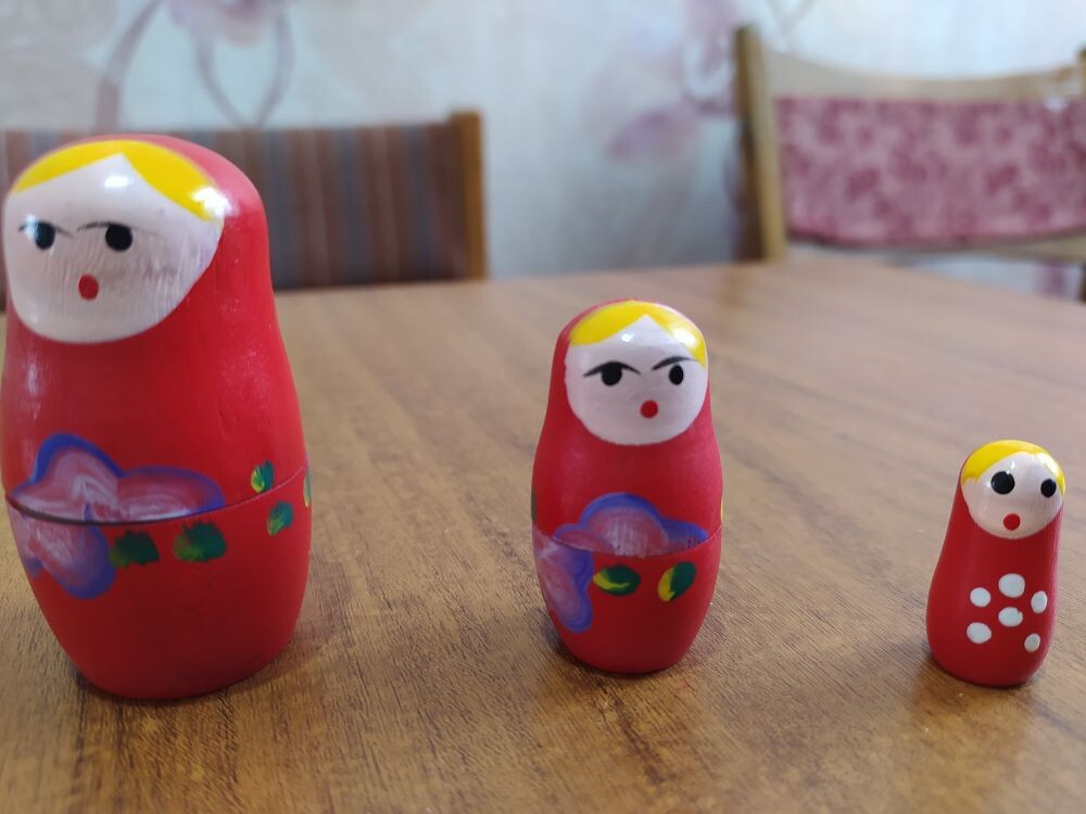 Педагог показывает матрешку, потряхивая ее. В ней что-то гремит. Это заинтересовывает ребенка. Взрослый открывает ее и достает вкладыш. Обе матрешки ставит рядом и говорит: «Матрешки красивые, но разные – большая и маленькая». Далее встряхивает маленькую: оказывается в ней что-то есть. Достав еще одну матрешку, выстраивает все три предмета в один ряд и подчеркивает их разницу в величине. Малыш рассматривает и показывает с помощью взрослого, где большая, где маленькая и где средняя. Не следует требовать от ребенка произнесения названий величины, важна лишь практическая ориентировка в размерах предметов.