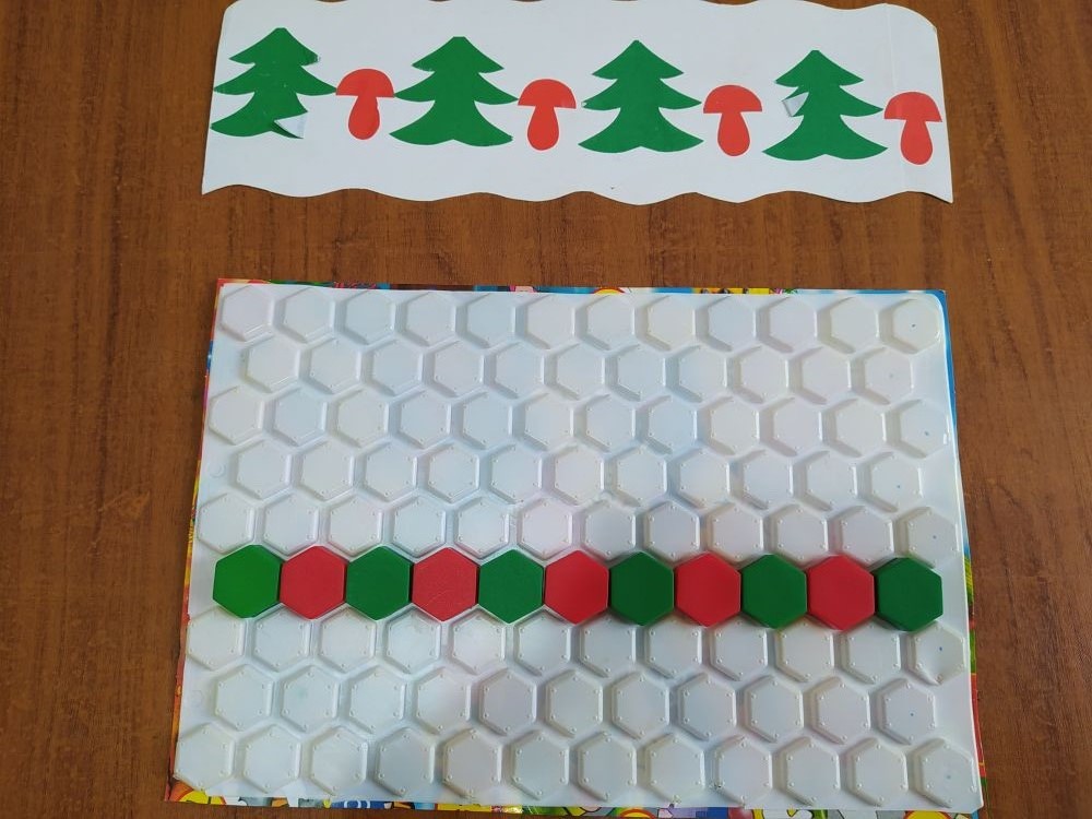 Педагог рассматривает с ребенком картинку-аппликацию, показывает ему мозаику разного цвета. Далее он выбирает зеленый элемент и говорит, что елочки бывают такого (зеленого) цвета, и размещает на панели елочку – элемент зеленого цвета; показывая элемент красной мозаики, поясняет, что такого (красного) цвета бывают грибочки. Разместив у себя на панели елочку, грибочек, елочку, грибочек, педагог читает «Елочки нарядные стали все в рядок, и за каждой елочкой спрятался грибок». Ребенок выполняет задание самостоятельно. Если он, разместив две - три пары элементов правильно, начинает ошибаться, можно спросить: «У тебя все правильно? Почему два грибка вместе?», помогая исправить ошибки. Можно использовать поэлементный диктант: «Елочка, грибочек, елочка, грибочек».