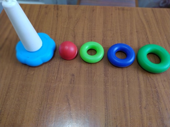 Учитель показывает кольца на стержне (на нем сначала одеты маленькие, а затем, внизу - большие). Он снимает сначала маленькие, объясняя "Вот маленькое колечко и еще маленькое колечко" и т.д. Снятые кольца размещают справа от стержня. Далее он обращает внимание на большие кольца, поясняет что они не такие, как прежние: "Они другие, вот какие - большое колечко, еще большое колечко, еще и еще" (складывает их справа от маленьких колец). Потом учитель собирает кольца на стержне. Надев большое кольцо, предлагает ребенку надеть такое же колечко. Затем надеваются точно также маленькие кольца. Главное условие: снятые кольца обязательно должны быть разложены в один ряд по размерам. Если ребенок научится выполнять занятие, его усложняют, можно теперь выбирать большие из перемешанных колец разного размера (или маленькие).