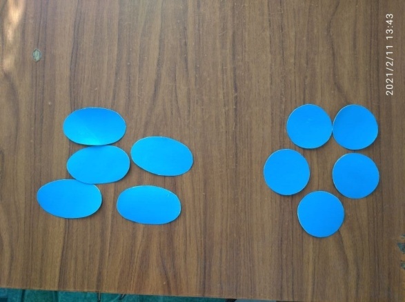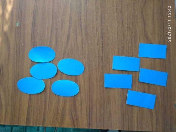 Материал: одинаковые по цвету, величине, фактуре квадраты и прямоугольники, круги и овалы, овалы и прямоугольники. Индивидуальный материал берется из расчета по 5 предметов одной и 5 предметов другой формы на ребенка.