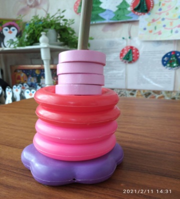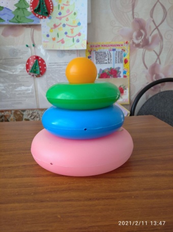 Педагог показывает ребенку пирамидку и говорит, что она очень красивая. предлагает снять с пирамидки колечки (ребенок уже имеет этот навык). Он фиксирует внимание ребенка на том, что кольца у пирамидки разные. Сняв первое кольцо показывает его ребенку и поясняет, что оно совсем маленькое (кладет его рядом с основанием пирамидки справа). затем снимает следующее кольцо, показывает и объясняет, что оно побольше 9кладет его рядом с первым, справа от него). Постепенно демонстрирует каждое следующее кольцо, сопровождая показ словами: «Это большое кольцо, вот какое». На столе все кольца раскладываются ровно по возрастающей величине справа от пирамидки. Затем в соответствующем порядке пирамидка собирается. Педагог поясняет: «Вот самое большое кольцо, вот поменьше, а это самое маленькое». Закрыв пирамидку колпачком, нужно предложить ребенку провести руками вдоль ее поверхности сверху вниз, чтобы он почувствовал, что пирамидка к низу расширяется; все колечки на месте, пирамидка собрана правильно. Когда ребенок приступает к самостоятельным действиям, педагог показывает, как снять вершину, куда ее положить (справа, рядом с основанием пирамидки). При снятии каждого кольца ребенку можно показывать место, куда его класть. Когда все кольца будут сняты, нужно обратить внимание ребенка на то, как много колечек и как красиво они выстроились в ряд. После того, как ребенок научится собирать пирамидку из трех колец, задание можно усложнить: научить правильно выбирать кольца из произвольно перемешанных. Также целесообразно увеличивать количество колец до 5- 6-ти.