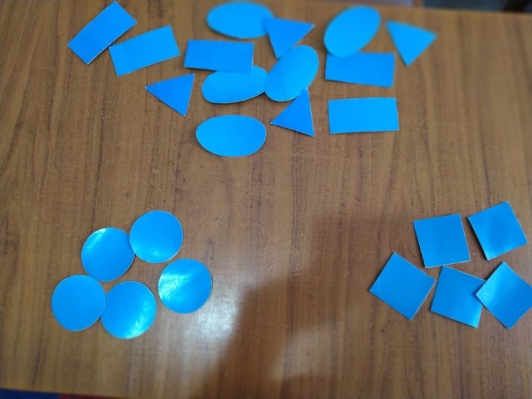 Материал: круги и квадраты, прямоугольники и треугольники, одинаковые по величине, цвету, фактуре (всех фигур по 5 штук).