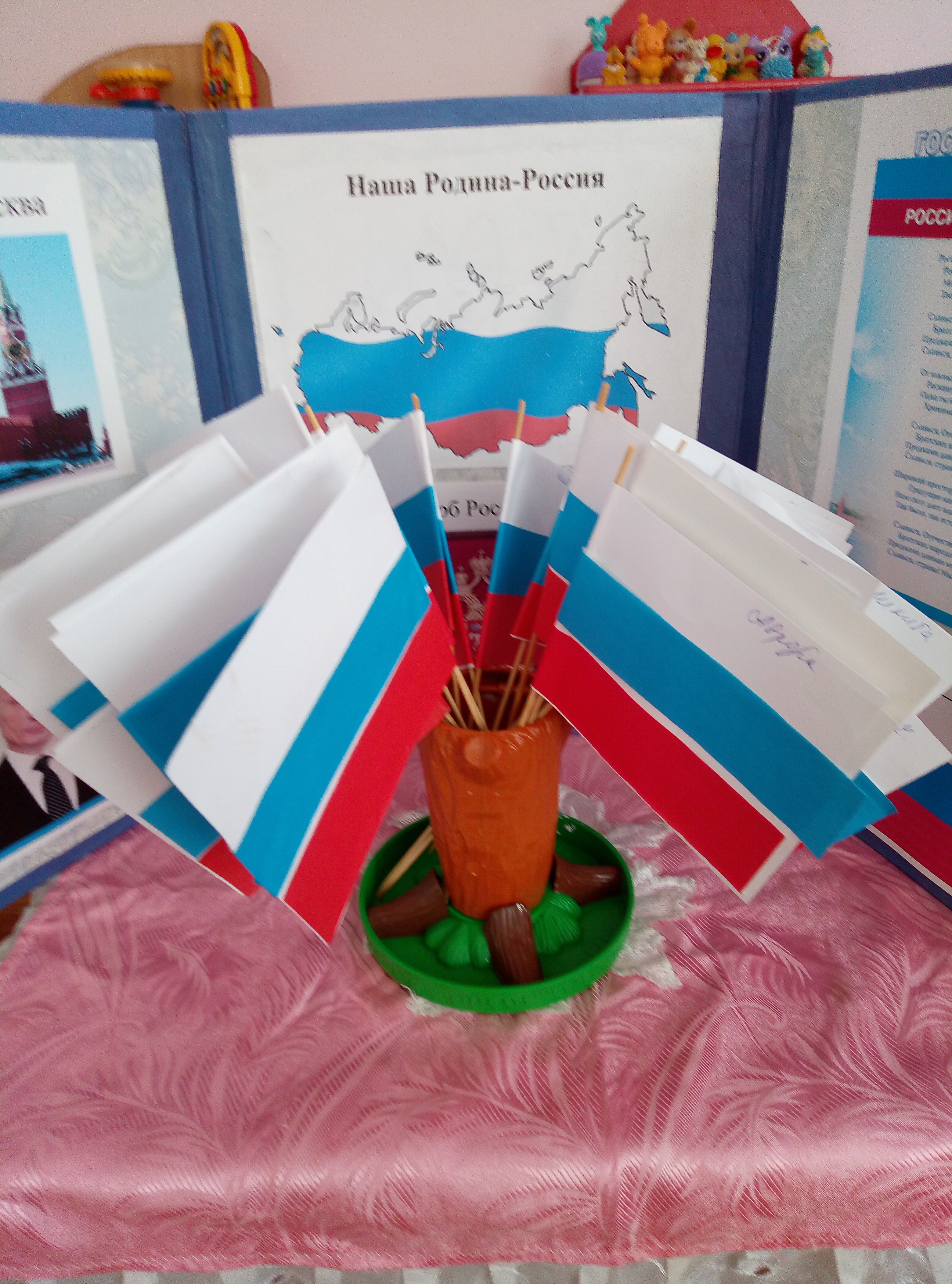 Воспитатель: У каждой страны есть свой флаг, в нашей стране — России - тоже есть государственный флаг (внести флаг)