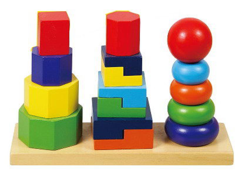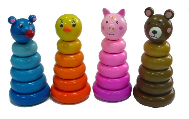 Детям постарше интереснее заниматься с пирамидками из множества колец разной формы и цвета, а так же сложными пирамидками с «секретами». Например, чтобы надеть колечко, нужно правильно его расположить.