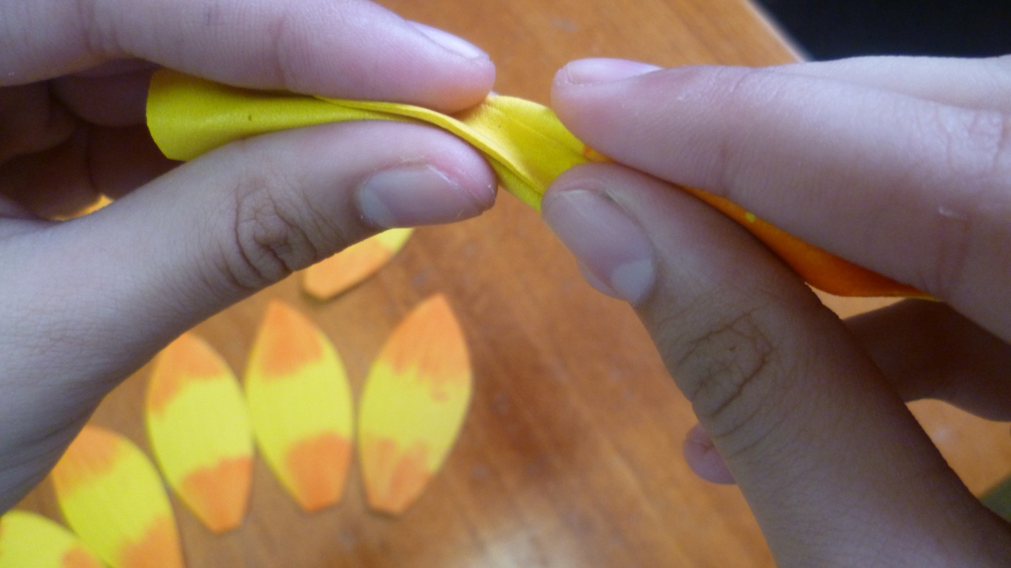 Следующий этап – сжимаем лепесток посередине и сворачиваем, расправляем, тем самым придаем им натуральную форму.