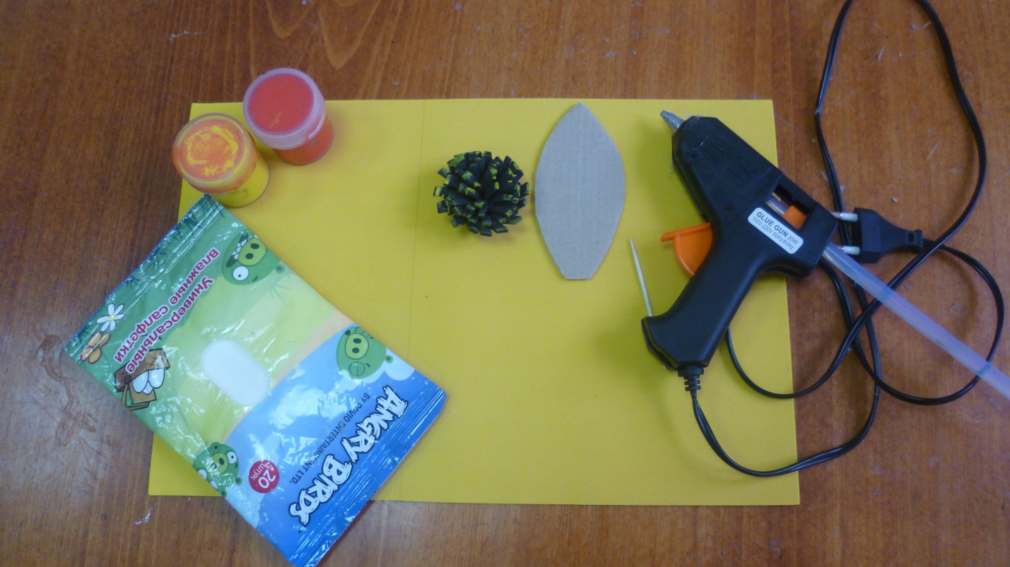 Готовый цветок из фоамирана, фоамиран желтого цвета, готовая серединка цветка, ножницы, зубочистки (для обведения шаблонов) , шаблоны лепестка листиков, серединки, клеевой пистолет, акриловые краски, шпажка, стейп-лента, компьютер.