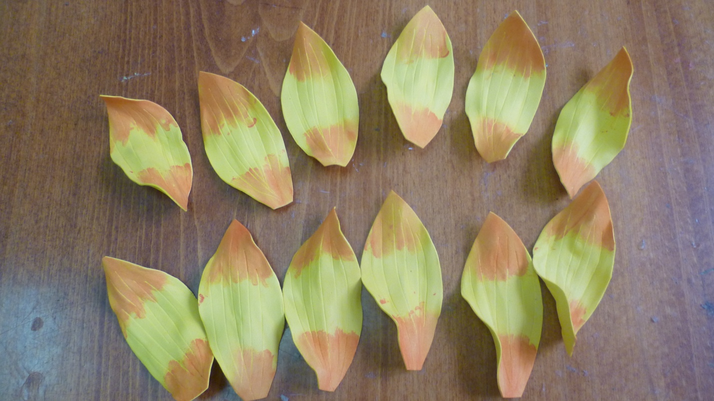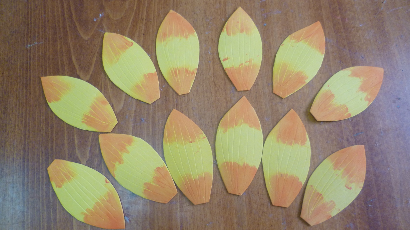 Приступаем к тонировки лепестков. Для этого смешиваем красную и желтую акриловую краску. При помощи влажных салфеток тонируем лепестки.