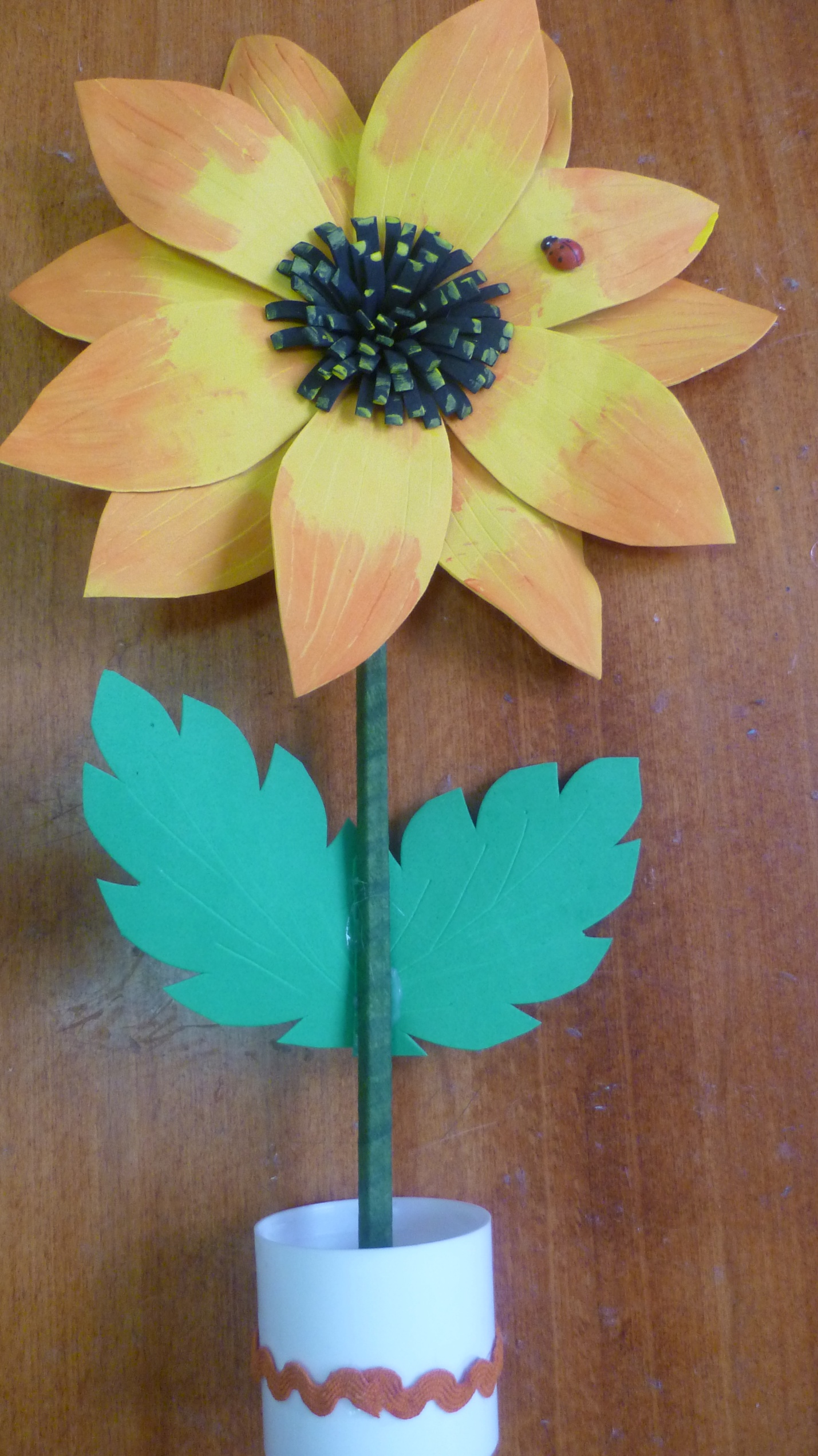 Вот у нас получился готовый цветок подсолнуха. Теперь берем шпажку, обматываем стейп-лентой и приклеиваем к подсолнуху. Затем приклеиваем листики и вставляем в горшочек.