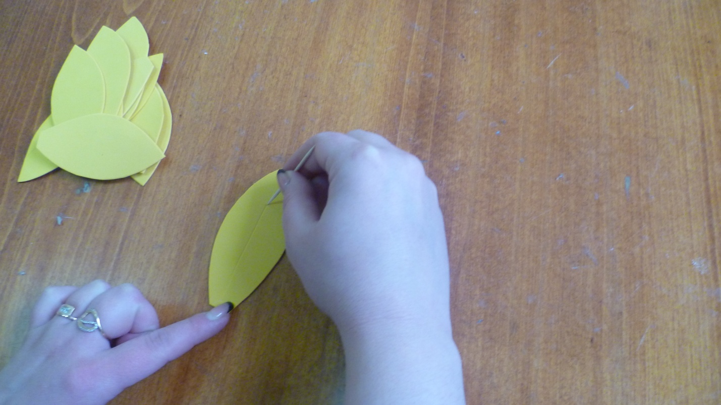 Следующий этап - обвести зубочисткой лепестки и вырезать их. Затем каждому лепестку сделать зубочисткой прожилки.