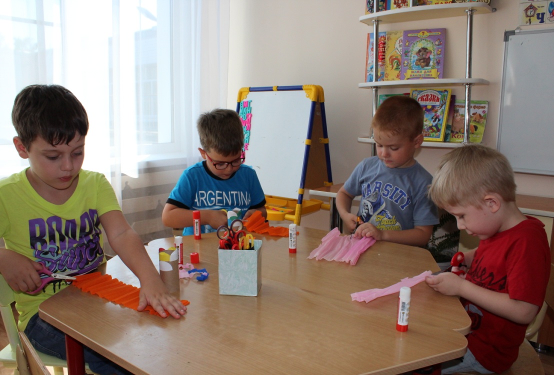 Нарезаем полоски из гофрированной бумаги и приклеиваем их к хвосту рыбы, фиксируя полоски с внутренней стороны картонной трубочки.
