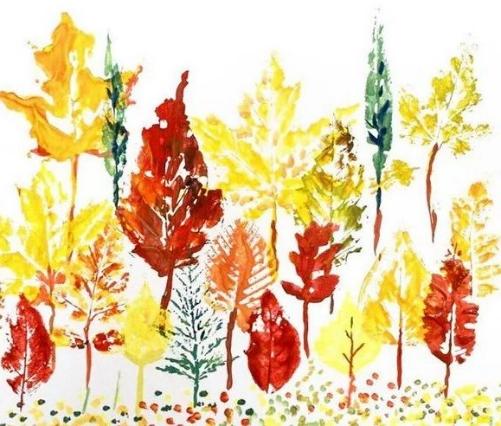 Воспитатель: Сказки помните отлично. Маленький Мишутка принёс конверт с ещё одним заданием рисование в технике «Печать листьями» - используются различные листья с разных деревьев. Они покрываются краской при помощи кисточки, не оставляя пустых мест, делается это на отдельном листе бумаги. Затем окрашенной стороной плотно прижимают к бумаге, стараясь не сдвигать с места. Листья можно использовать и повторно, нанося на него другой цвет, при смешении красок может получиться необычный оттенок, остальное прорисовывается кистью. Получаются великолепные пейзажи.