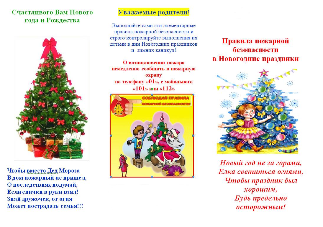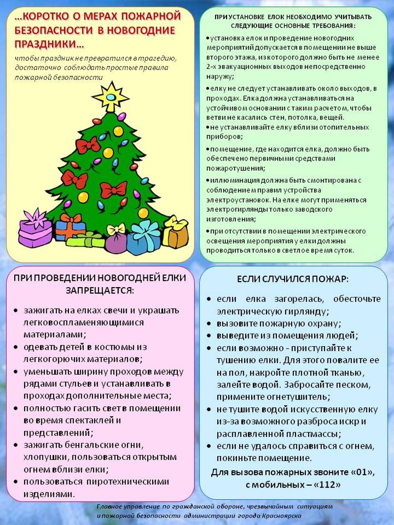 В о время новогодних праздников, помимо обычных правил пожарной безопасности следует соблюдать ещё несколько простых норм, которые позволят вам получить от выходных дней только положительные эмоции: 1. Не украшайте ёлку матерчатыми и пластмассовыми игрушками. 2. Не обкладывайте подставку ёлки ватой. 3. Освещать ёлку следует только электрогирляндами промышленного производства. 4. В помещении не разрешается зажигать бенгальские огни, применять хлопушки и восковые свечи. Помните, открытый огонь всегда опасен! 5. Не следует использовать пиротехнику, если вы не понимаете, как ею пользоваться, а инструкции не прилагается, или она написана на непонятном вам языке. 6. Нельзя ремонтировать и вторично использовать не сработавшую пиротехнику. 7. Категорически запрещается применять самодельные пиротехнические устройства.