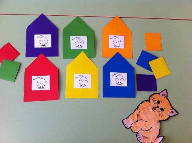 Послушайте сказку о волшебных красках. Жили-были в одной сказочной стране краски. Каждая краска жила в своем сказочном замке. Красная краска в красном замке (рисую на мольберте красное пятно), и в нем все было какого цвета? Рядом стоял замок синей краски, а у нее все было какое? Чуть дальше - замок зеленой краски. Там все было какое? А еще дальше стоял замок желтой краски, в нем все было желтое. Краски любили, как и все дети, ходить друг к другу в гости, и вот что у них получилось. Как-то раз пошла красная краска в гости к желтой (набираю красный цвет и переносим в замок желтой краски). Что получилось? Оранжевый цвет. А синяя краска пошла в гости к красной. Что получилось? и т.д.