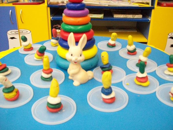 Ход: рассмотреть образец пирамидки. Каждый раз надо находить и надевать на стрежень самое большое из оставшихся колец.