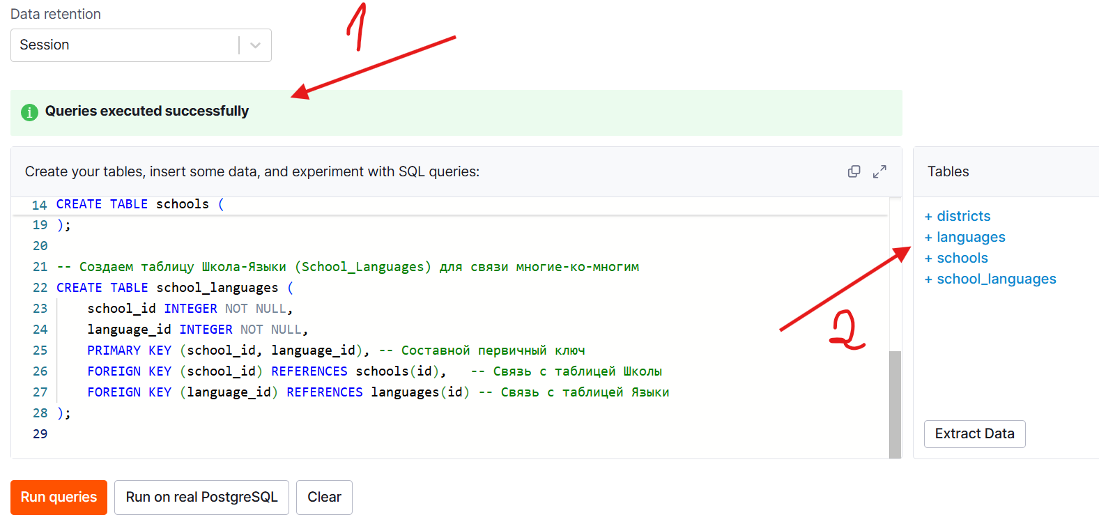 Для демонстрации работы скриптов использован on-line сервис PostgreSQL https://aiven.io/tools/pg-playground