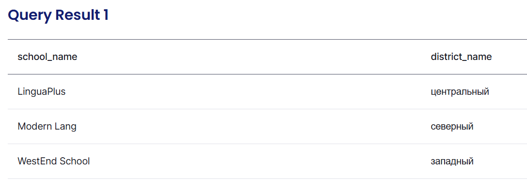 INSERT INTO schools (id, school_name, district_id) VALUES (1, 'LinguaPlus', 1); -- центральный