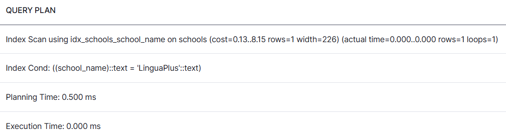 Мы создали индекс idx_schools_school_name на столбце school_name.