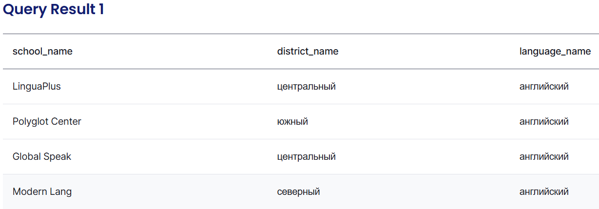 JOIN связывает таблицы schools, districts и school_languages для сбора полной информации.