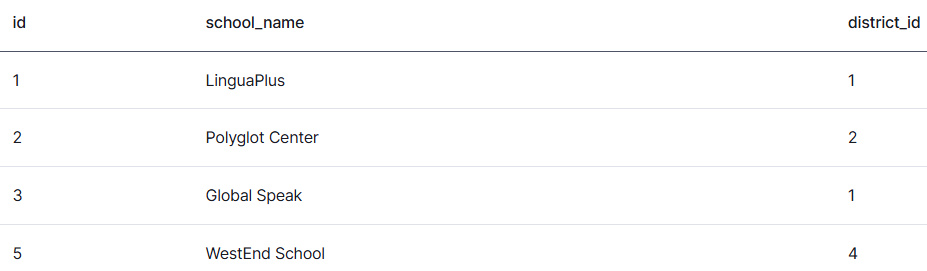 (Теперь в результате отсутствует школа с id = 4)