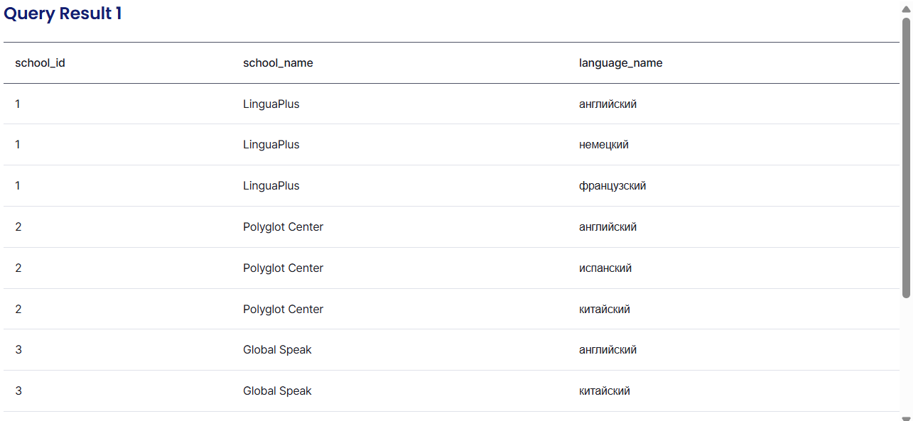 Создать триггер, который при удалении школы из таблицы schools автоматически удаляет все связанные с ней записи о языках из таблицы school_languages. 1. Смотрим текущие данные (для проверки) Сначала посмотрим, какие языки преподаются в каких школах, чтобы иметь точку отсчета.