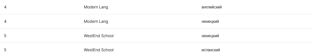 Удалим школу 'Modern Lang' (ее id = 4). Таблица school_languages до удаления