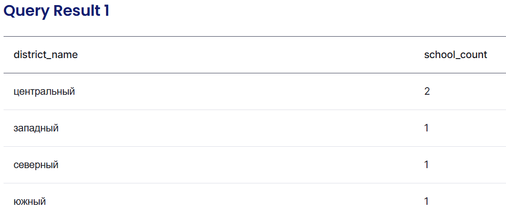 Вывести количество школ в каждом районе. Этот запрос показывает, сколько школ зарегистрировано в каждом из районов.