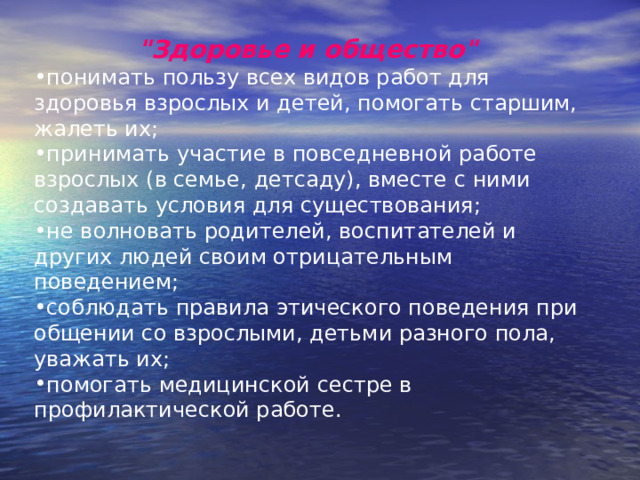 V. Воспитывать у детей желания активно участвовать в оздоровлении окружающих людей, используя приобретении элементы практических привычек.