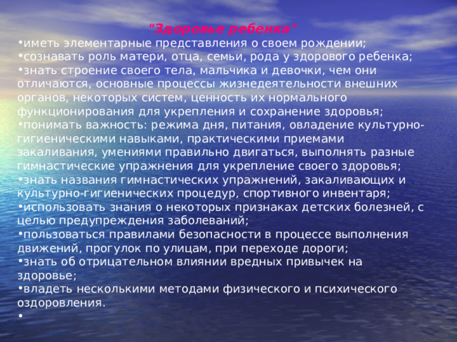 формирование и развитие теоретических знаний и практических умений у детей раннего и дошкольного возраста, необходимых для понимания многомерного и многосложного понятия здоровья и процесса его укрепление и сохранение;