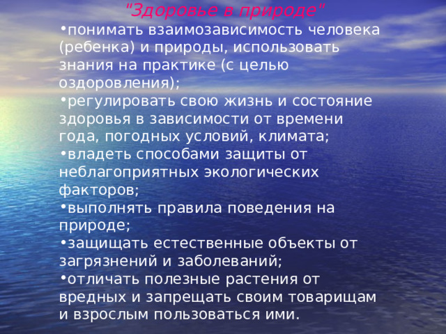 понимать взаимозависимость человека (ребенка) и природы, использовать знания на практике (с целью оздоровления);