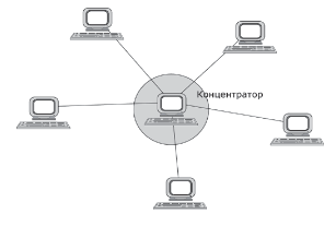 широковещательную звездообразную сеть, предусматривающую использование центрального узла как безбуферного повторителя, который направляет все приходящие сигналы во все исходящие из него линии.