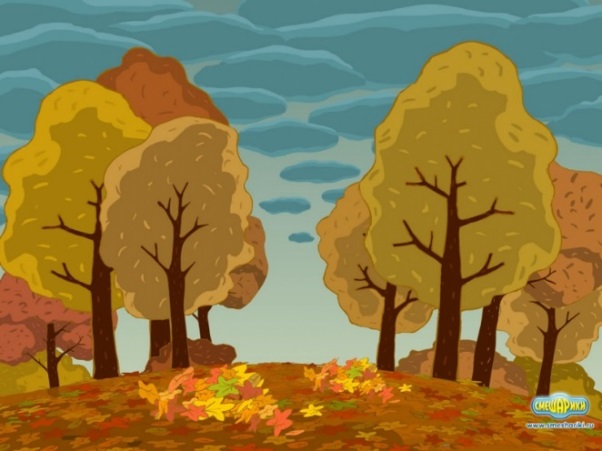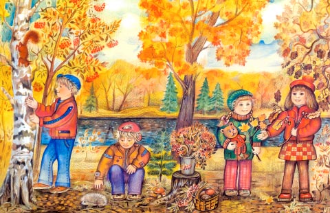 Наступила золотая осень. Листья на деревьях желтеют и падают на землю. Земля становится похожей на красивый ковер. Дети вышли на прогулку в парк. Все ищут самые красивые листья. Один мальчик собрал букет из разноцветных листьев и подарил девочке.