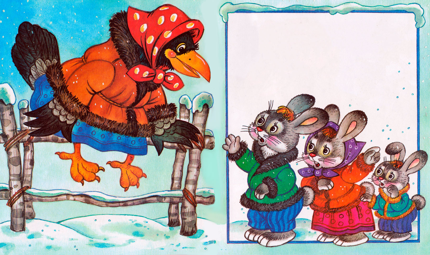 Раз сидела ворона на заборе, собаки её подхватили и давай мять, а заяц это увидел и думает: «Как бы вороне помочь?»