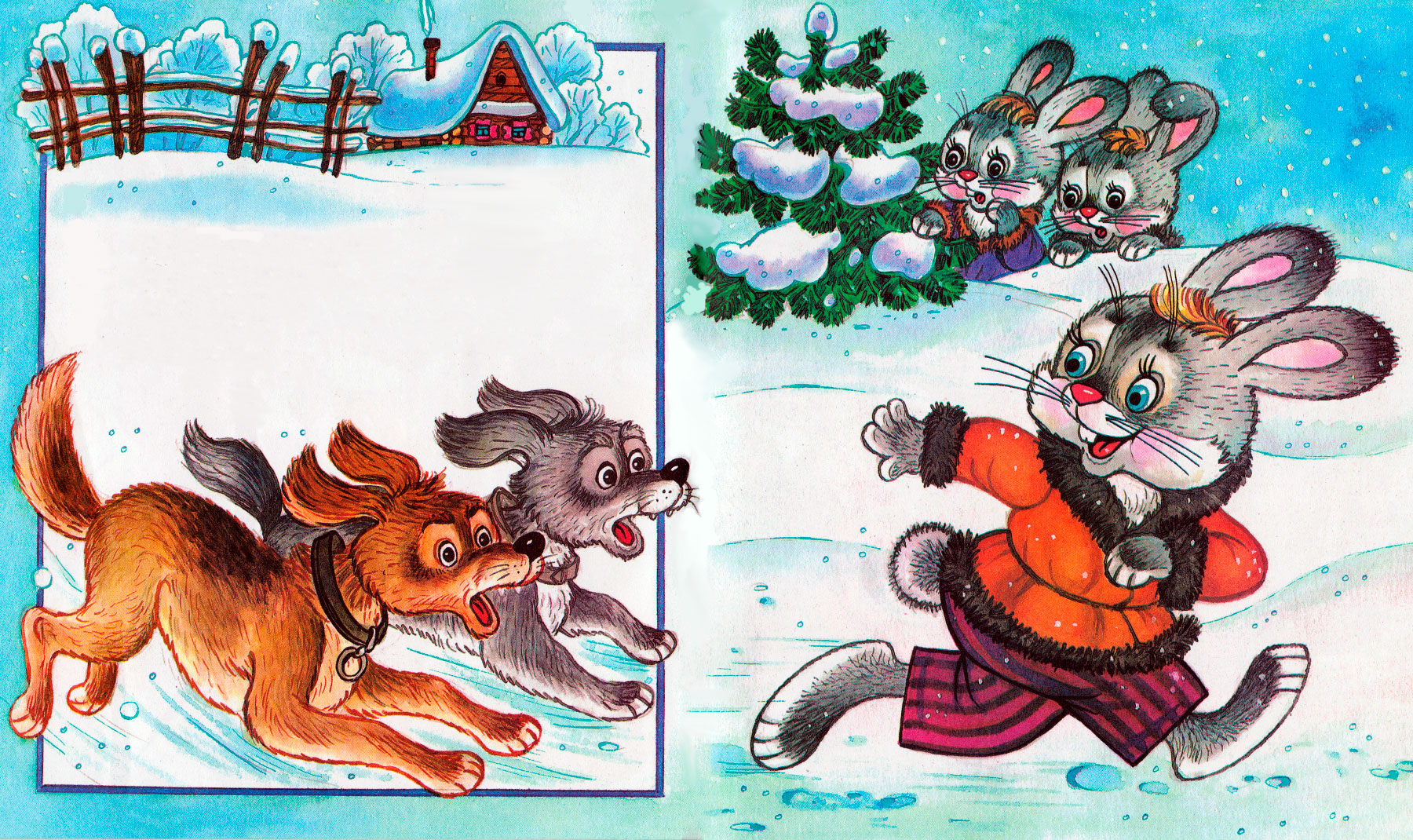 Выскочил на горочку и сел. Собаки увидали зайца, бросили ворону — и за ним, а ворона опять на забор. А заяц от собак ушёл.