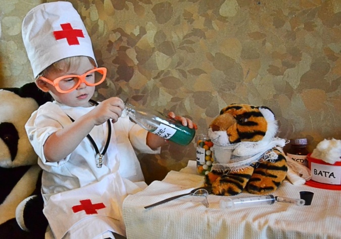 Игровой инвентарь: куклы, набор доктора и/или предметы-заместители Роли: Врач, ребенок и его мама. Сюжет: Мама приводит ребенка-куклу на прием к врачу. Доктор осматривает малыша, используя различные медицинские инструменты (слушает дыхание, проверяет глазки и ушки, меряет температуру), а после делает ему прививку.
