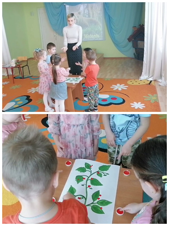 Воспитатель: Справились с заданием, посмотрите, какие красивые ягодки малины у нас получились. (Воспитатель вместе с детьми рассматривает рисунок).