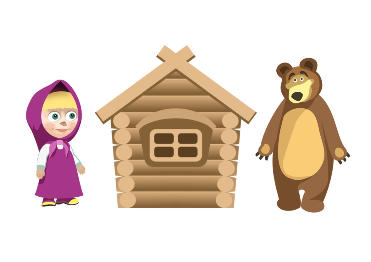 - Наклейте домик в центре картинки, а Машу и Медведя по разные стороны от домика.