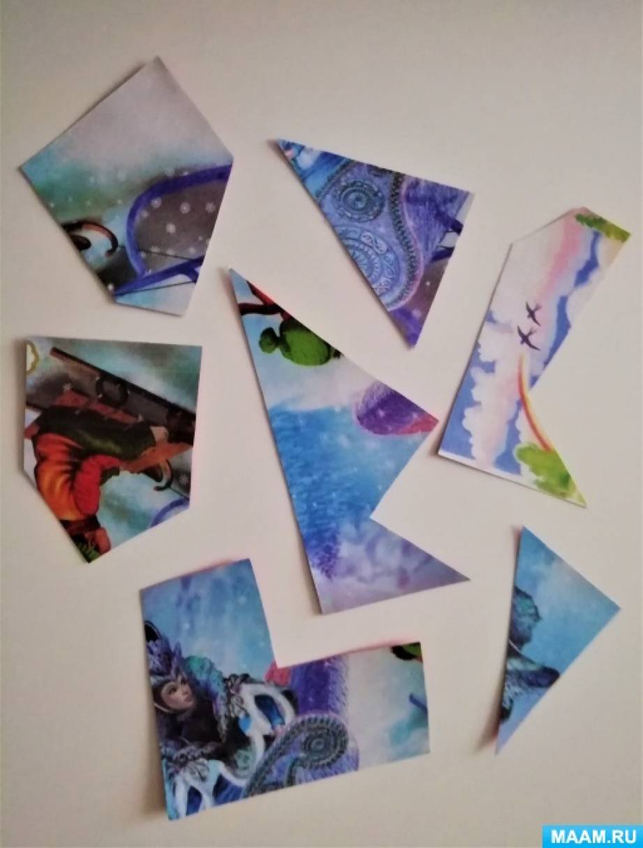 Оборудование: «Письмо» из страны сказок, конверты с заданиями, «ковер-самолет», разрезные картинки по мотивам сказок («Крошечка-Хаврошечка», «Снежная королева», мяч, иллюстрации к сказкам («Дюймовочка», «Сестрица Алёнушка и братец Иванушка», «Маша и медведь», «Три медведя», «Айболит», «Буратино», «Теремок», «По-щучьему веленью», «Колобок»).