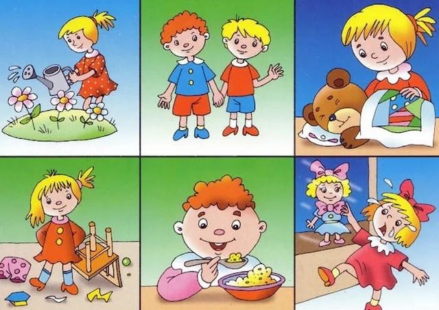 Воспитатель: Ребята, подойдите ко мне по очереди, возьмите картинку. Посмотрите внимательно на картинку: опишите поступок, изображенный на рисунке. Хороший это поступок, или плохой? Если это хороший поступок – выберите зеленый кружочек, а если плохой – красный (дети выбирают кружочки и объясняют свой выбор).