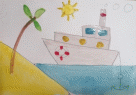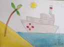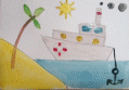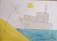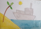 Толстой кисточкой берем белую краску и аккуратно обводим, а затем закрашиваем кораблик. Желтой краской разукрасим солнышко и песок на берегу, взяв синюю краску закрасим море.