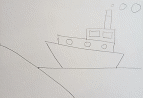 Продолжаем делать тонкой кисточкой детали рисунка. Этой же кисточкой с черной краской рисуем дым из трубы и якорь.
