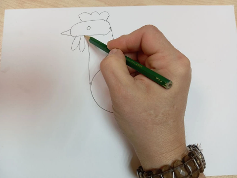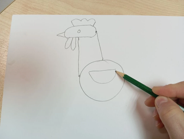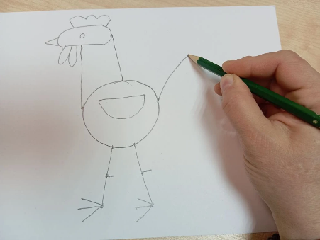 Крылышко петушка нарисуем с помощью прямой палочки и полукруга.