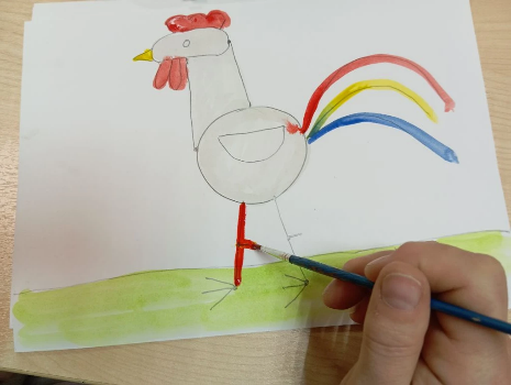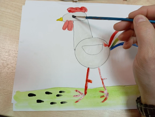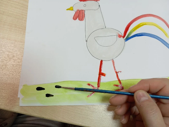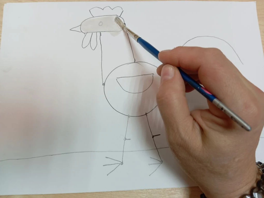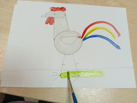 .Маленькой кисточкой берем желтую краску и закрашиваем клюв. Затем берем красную краску разукрашиваем ноги петушка.