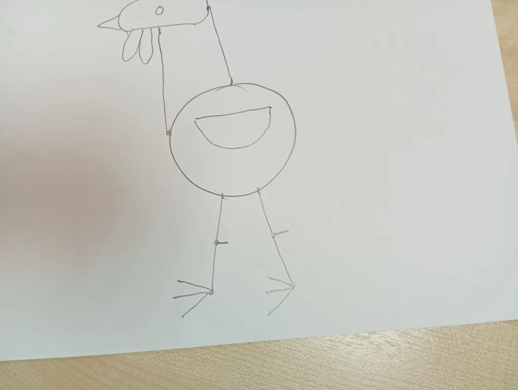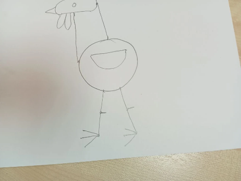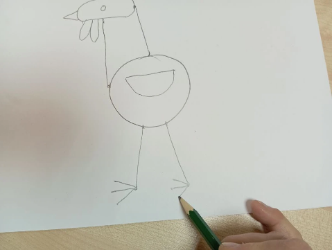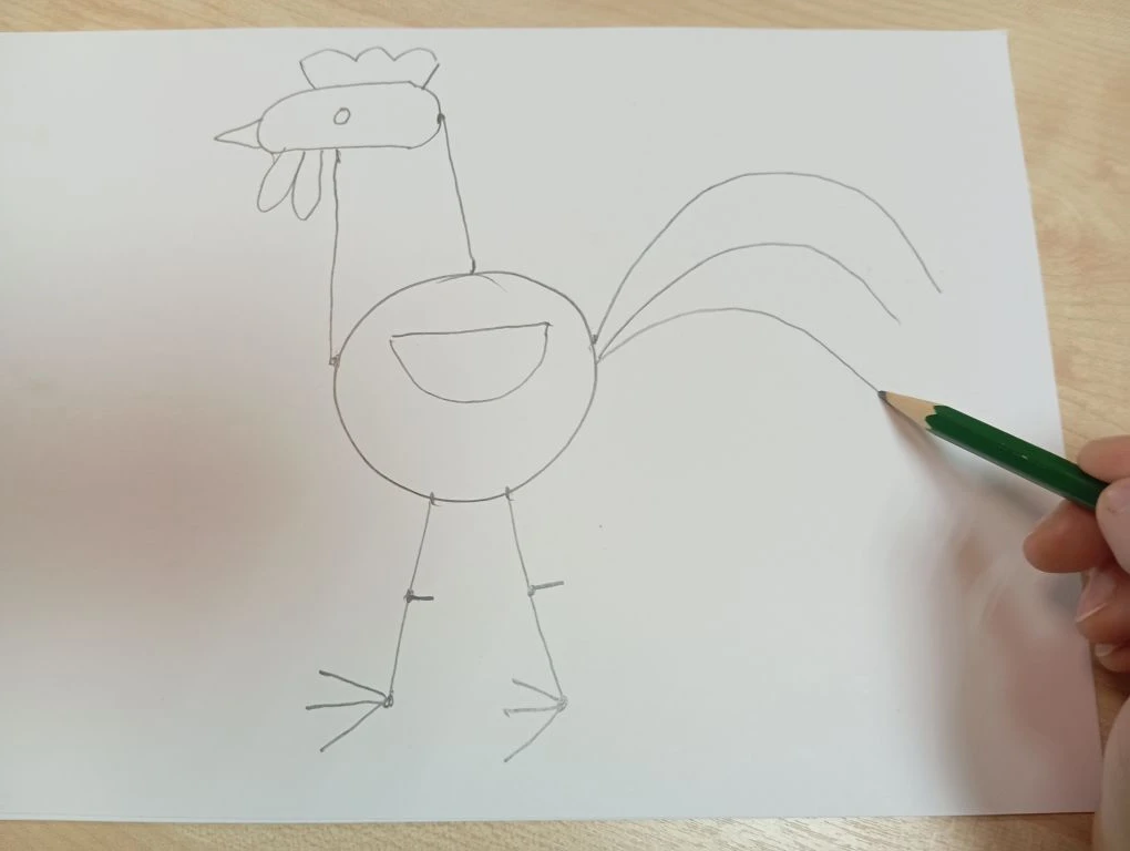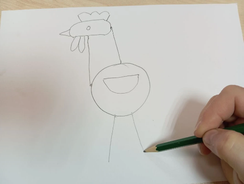 Затем в нижней части туловища нарисуем две линии вниз – лапки петушка. И на конце каждой лапки изобразим по три палочки в левую сторону –коготки, а в правую сторону по одной палочке – шпоры.