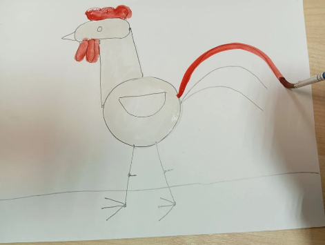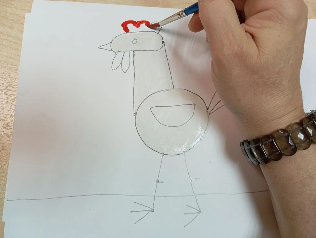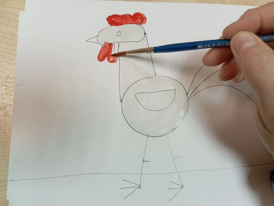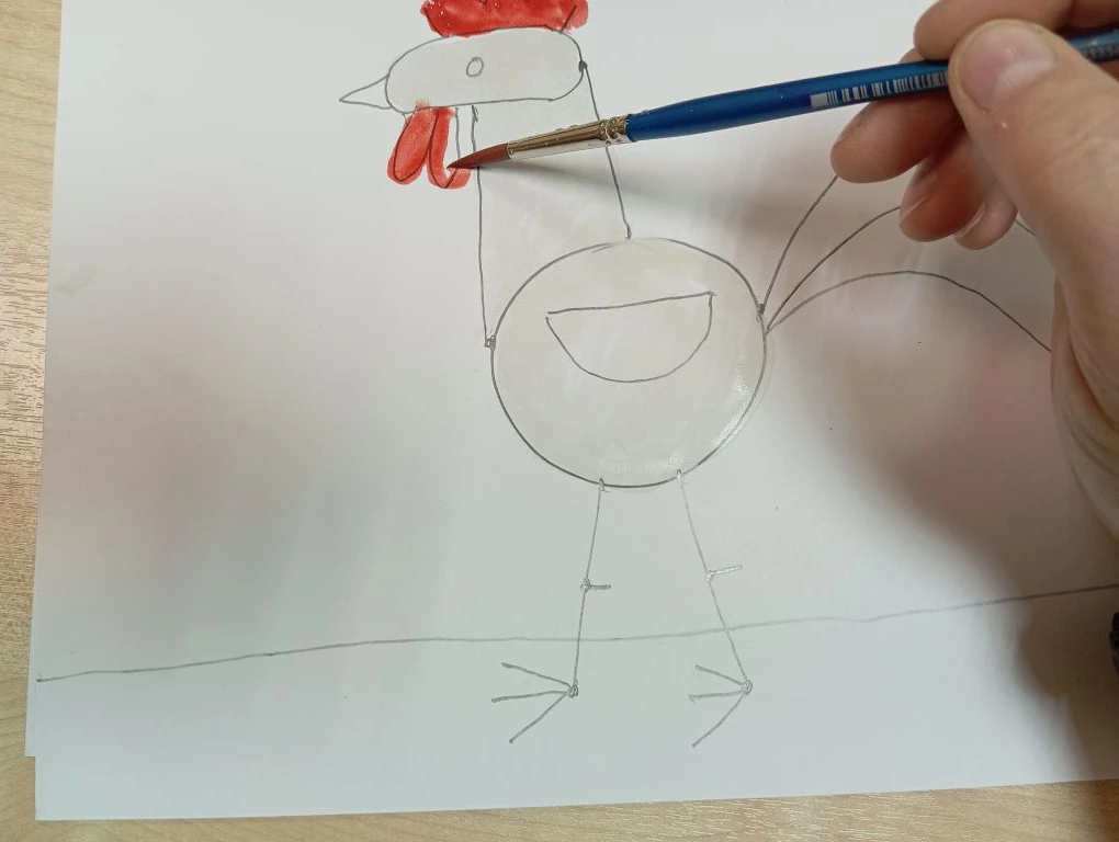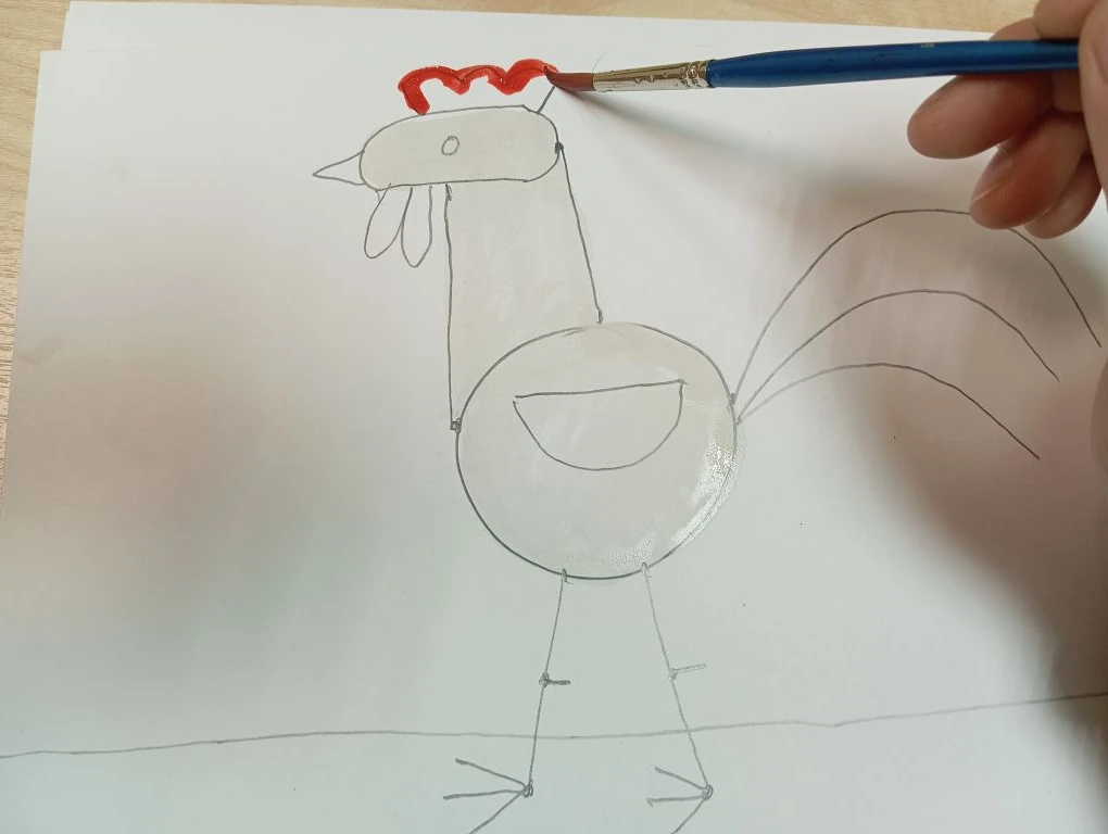 Затем берем красную краску и разукрашиваем гребешок и бородку у петушка.