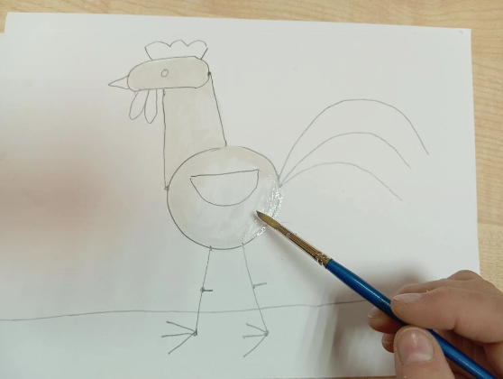 Толстой кисточкой берем белую краску и аккуратно обводим, а затем закрашиваем голову, шею и туловище петушка