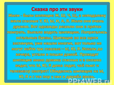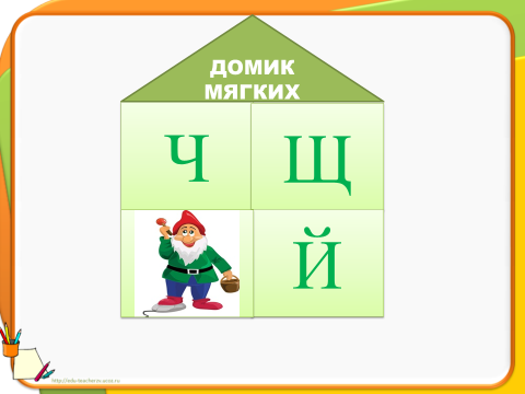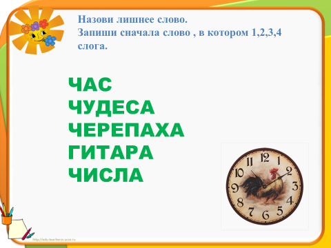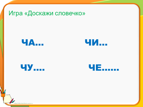 | Ход занятия Речевая разминка Проговариваем скороговорку (повторяем несколько раз) Черепаха не скучая, час сидит за чашкой чая. -Артикуляционная гимнастика Игра «Доскажи словечко» -Дополни слоги до слов -Буква «Ч» гласная или согласная? -Почему живет в домике «всегда мягких согласных» -Прочти слова, назови лишнее слово -Назови слово, в котором 1 слог, 2 слога, 3 слога, 4 слога -Послушай сказку про Ж Ш Ч Щ Выучим правило: Ча-ща –пишем только с буквой «А» Чу-щу – пишем только с буквой «У» Работаем в тетрадях Задание №1. Звуковой анализ слов ЧУДЕСА Ч У Д Е С А -Сколько букв в слове? -Нарисуй столько же клеточек-домиков для каждой буквы, сколько букв в слове чудеса -Делим слово на слоги (чу-де-са) 3 слога -Какая гласная в 1 слоге? (у) Раскрашиваем ее домик красным цветом -Какая гласная во 2 слоге? (е) Раскрашиваем ее домик красным цветом -Какая гласная в 3 слоге? (а) Раскрашиваем ее домик красным цветом -Каким цветом раскрашиваем домик «Ч» (зеленым), т. к. она всегда мягкая -Каким цветом раскрашиваем домик «Д» (зеленым), т. к. рядом стоит буква «Е» - она смягчать может, она гласная нижнего ряда -Каким цветом раскрашиваем домик «С» (синим), т. к. рядом стоит «А»-она смягчать не может, она гласная верхнего ряда -Поставь в слове ударение Сделай звуковой анализ слова ЧЕРЕПАХА самостоятельно Задание №2. Отгадай загадки, запиши отгадки, подчеркни красным карандашом сочетание ча-ща, чу-щу По небесам оравою Бегут мешки дырявые, И бывает — иногда Из мешков течёт вода. Спрячемся получше От дырявой … ТУЧА Опасней всех она в реке, Хитра, прожорлива, сильна, Притом — такая злюка! Конечно, это… ЩУКА Снаружи я стальной, Внутри я водяной, Я на плите стою Всех чаем напою. ЧАЙНИК Кто, ворочая усами, Раскомандовался нами? Можно есть! Пора гулять! Умываться и в кровать! ЧАСЫ ТУЧА ЩУКА ЧАЙНИК ЧАСЫ |