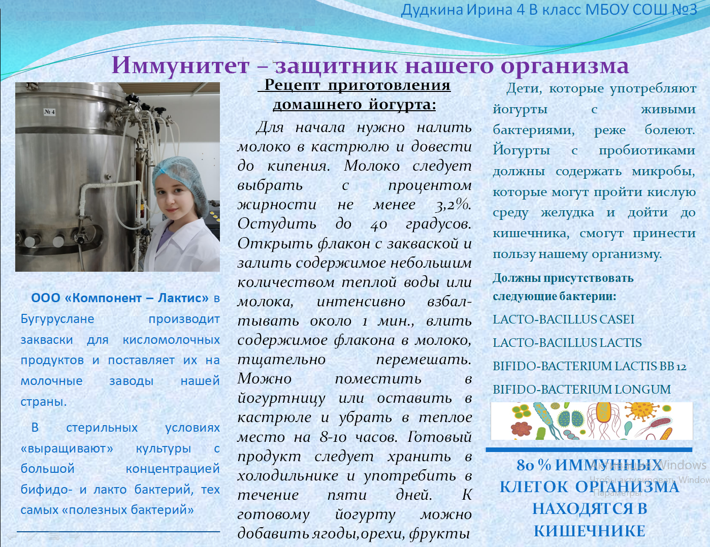 Актуальность: Современному человеку необходима защита от опасных инфекций. В нашем городе работает уникальное предприятие, производящее закваски для кисломолочных продуктов, способствующих повышению иммунитета.