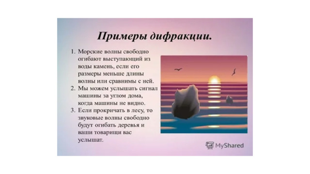 Дифракция – отклонение от прямолинейного распространения при огибании волнами препятствий
