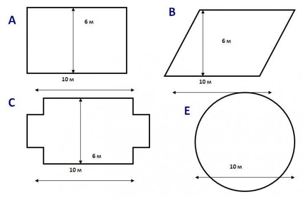 17. У садовника имеется 32 метра провода, которым он хочет обозначить на земле границу клумбы. Форму клумбы ему надо выбрать из следующих вариантов (см. рис.).