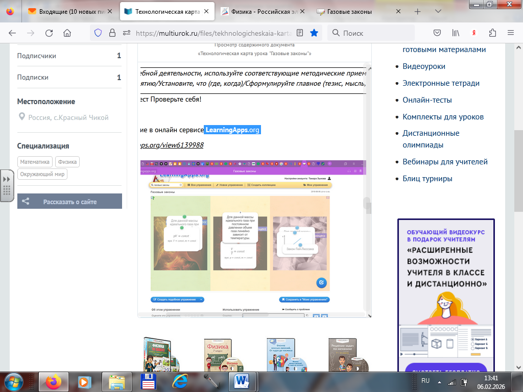 | 5 | Реализация построенного проекта | 8 мин | Заполнить таблицу «Газовые законы» работа в парах (учащиеся используют ноутбуки) Учащиеся делают выводы. | https://learningapps.org/view6139988 | https://LearningApps.org |